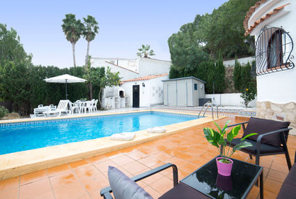 Benissa à 6 km de Morarira: Belle maison individuelle accueillante "Villa Zen", environnée par les arbres. En bordure de la localité, à 5.8 km du centre de Benissa en-dehors de la localité, à 10.4 km du centre de Calpe, dans l'arrondissement Montemar, situation tranquille quartier résidentiel, à 1.8 km de la mer, à 1.8 km de la plage. A usage privé: terrain (clôturé), piscine (8 x 4 m, 01.01.-31.12.). Douche extérieure, meubles de jardin, barbecue. Infrastructures de la Maison: système d'alarme. Place de parking sur le terrain. Magasins 2.4 km, magasin d'alimentation 2.4 km, supermarché 2.4 km, centre commercial 2.4 km, restaurant 2.5 km, bar 2.4 km, boulangerie 2.4 km, café 2.4 km, plage de sable "Playa Moraira" 5.2 km, plage de rochers "Cala del Baladrar" 1.4 km, crique pour baignade 1.4 km. Port plaisance 6.1 km, marina 6.1 km, terrain de golf 2.6 km, ecole de surf 6.1 km, ecole de voile 6.1 km. Attractions à proximité: Peñon d'Ifach, Castillo de Moraira. Région de randonnées: Sierra de Bernia. Veuillez noter: adapté(e) aux familles, indiqué pour séniors équipement pour bébés (inclus).