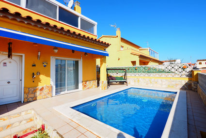 Maison jumelée accueillante, confortable "Puigmal", de 2 étages. Dans le quartier de Puigmal, à 3 km du centre d'Empuriabrava, situation tranquille, ensoleillée quartier résidentiel, zone avec peu de trafic, à 3.2 km de la mer, à 3 km de la plage, dans une impasse. A usage privé: terrain (clôturé), piscine (7 x 4 m, 01.05.-30.09.). Place de parking près de la maison. Magasin d'alimentation, supermarché, restaurant 500 m, bar 650 m, café 400 m, arrêt du bus 1 km, plage de sable "Empuriabrava" 3 km. Port de plaisance 3 km, terrain de golf 12 km, tennis 800 m, golf miniature 2 km, piste cyclable 900 m. Attractions à proximité: Aerodromo y Túnel de viento 800 m, Parque acuático Roses 3 km, Casino y Festival Perelada 14 km, Museo Dalí Figueres 15 km, Monasterio de Sant Pere de Rodes 20 km, Ruinas d'Empuries 23 km.Disponibilité