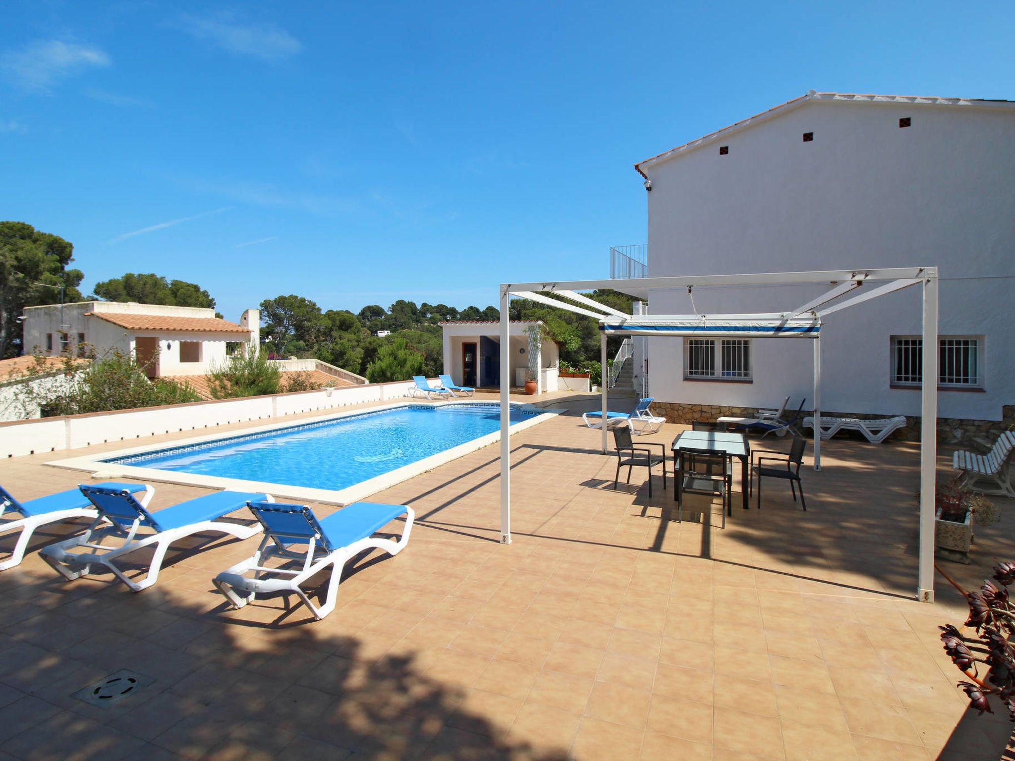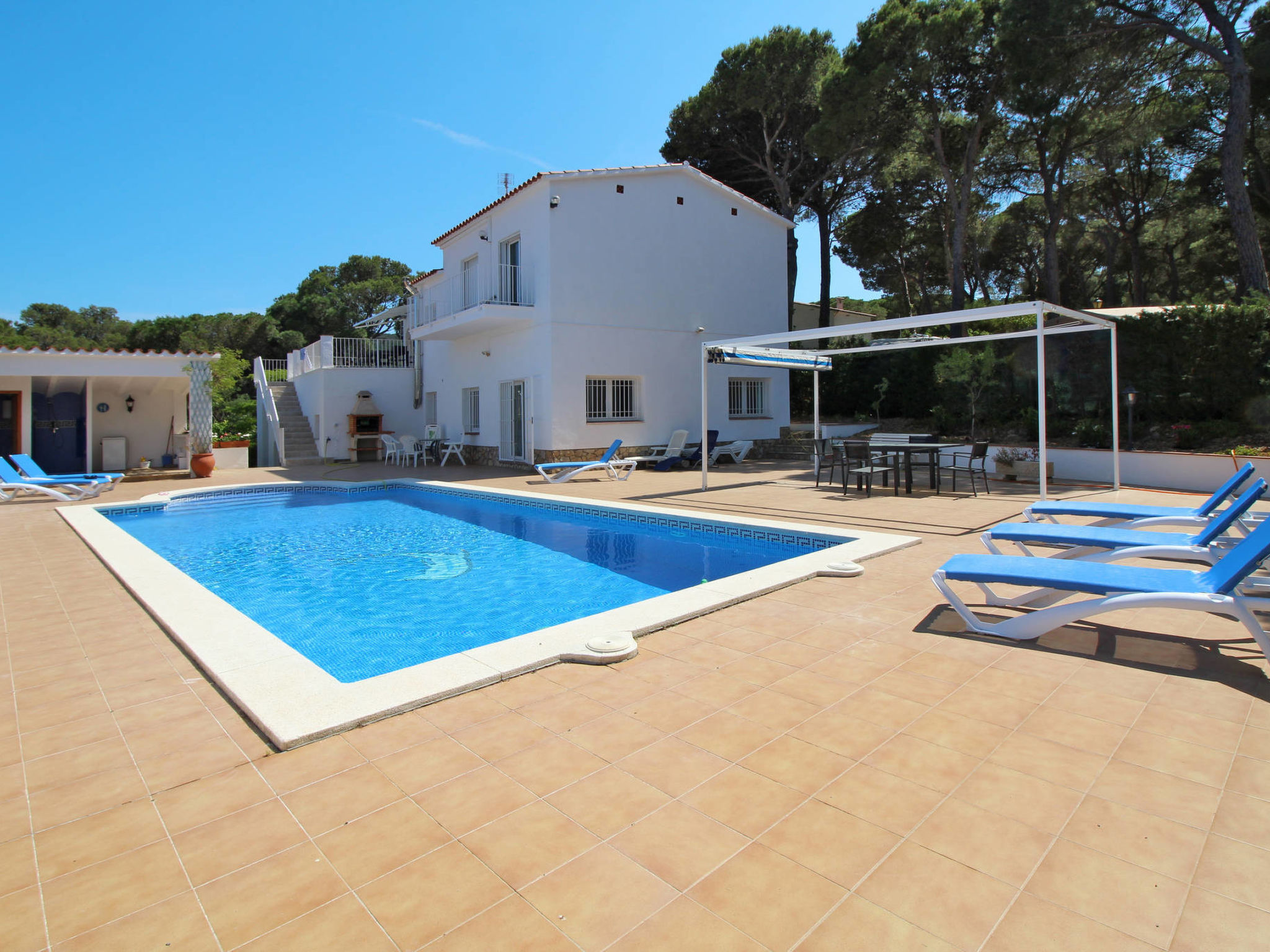Situation: voie sans issue. Accès/parking: 2 x stationnement sur le terrain. Le garage reste fermé. Terrain (à usage privatif): env. 400 m², arboré, dalles. Aménagements extérieurs(à usage privatif) : terrasse (en partie couvert/e), autre terrasse (store/marquise), balcon (couvert(e)), meubles de jardin mis à disposition, barbecue bâti. Piscine (à usage privatif) : 10 x 5 m, ouverte toute la saison. Espace piscine : carrelé, 10 bains de soleil, douche extérieure. ● Distances: Centre Playa de Pals env. 1 km. Gerona env. 45 km. Barcelona env. 140 km. Supermarché le plus proche env. 1 km. Aéroport Gerona env. 45 km. Mer env. 1 km. Plage de sable env. 1 km.