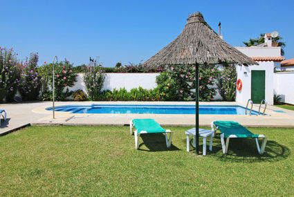 Bungalow "Juani". Dans le quartier de Roche Viejo, à 4 km du centre de Conil de la Frontera, à 2 km de la mer, à 2 km de la plage. A usage privé: terrain 1'000 m2, jardin avec pelouse et plantes, piscine (8 x 4 m, 01.03.-31.10.). Douche/WC dans le pool house, douche extérieure, jardinet, espace barbecue. Infrastructures de la Maison: terrasse sur le toit. Place de parking sur le terrain. Magasins 4 km, plage de sable "Conil de la Frontera" 4 km. Veuillez noter: voiture recommandée.Disponibilité