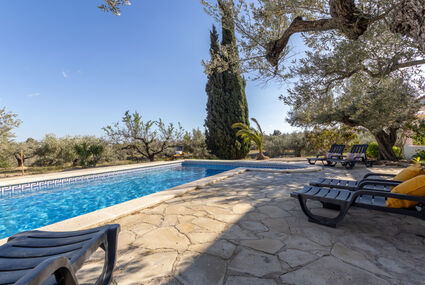 L'Ampolla à 5 km de L'Ampolla Playa: Maison à 2 apts rustique, confortable "Filou", environnée par les arbres et champs. Location composée d'un bâtiment principal et d'une annexe, en bordure de la localité, à 5 km du centre de L'Ampolla, situation isolée, tranquille, ensoleillée, à 5 km de la mer, à 5 km de la plage, dans une rue. A usage privé: terrain (clôturé), jardin naturel, piscine rectangulaire (4 x 8 m, profondeur 160 cm, disponibilité saisonnière: 01.Avr. - 31.Oct.) avec marches intérieures. WC dans l'espace piscine, douche extérieure, jardinet, meubles de jardin, barbecue. Infrastructures de la Maison: Connexion WIFI, air-conditionné, lave-linge. Place de parking sur le terrain. Centre commercial 5 km, restaurant 5 km, arrêt de bus "L'Ampolla" 11 km, gare ferroviaire "L'Ampolla" 10 km. Attractions à proximité: Parque Natural del Ebro 5 km, parque Portaventura 65 km, Pitch & Putt 2 km, Barcelona 170 km. Région de randonnées: Parque natural Puerto Tortosa Beseit 52 km. Veuillez noter: voiture recommandée. Adapté(e) aux familles. Groupes de jeunes sur demande seulement.Disponibilité